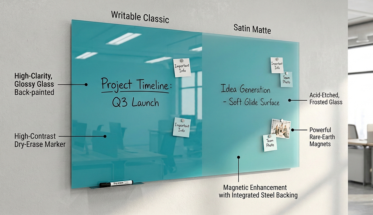 Magnetic Enhancement: Available for both Classic and Matte finishes. Our integrated steel backing allows you to use rare-earth magnets to pin notes or plans directly to the glass.
